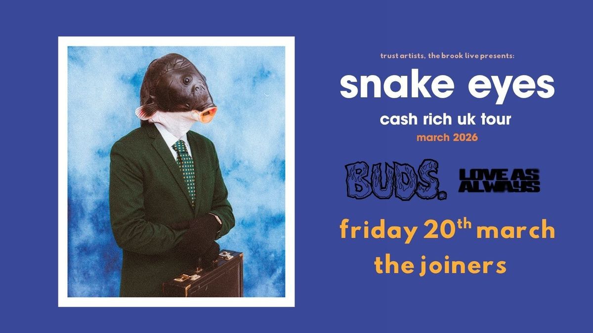 snake eyes is an indie-punk "grit pop" band from Brighton, UK, formed in 2020 by Jim Heffy (vocals/guitar) and Thomas Coe-Brooker (drums). The band creates fast-paced, hooky songs described as a blend of noise rock and indie pop, with lyrics focusing on self-expression and positivity. After releasing EPs like Skeletons and health, they gained significant traction, toured extensively, and signed with Alcopop! Records.Disclaimer: