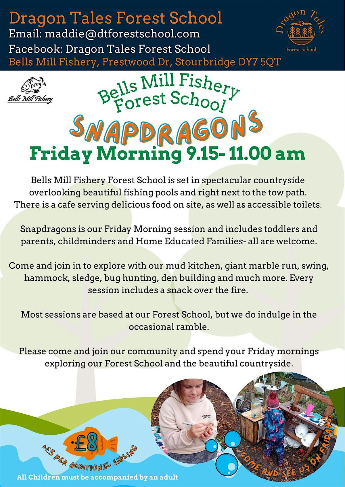 Bells Mill Fishery Forest School is set in spectacular countryside overlooking beautiful fishing pools and right next to the tow path. There is a cafe serving delicious food on site, as well as accessible toilets.