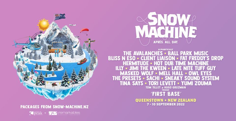 Snow Machine Queenstown 2022 Lineup Announce feat: The Avalanches, The Presets, Fat Freddy's Drop, Hermitude, Masked Wolf, Sachi, Hot Dub Time Machine, Client Liaison, Ball Park Music, Bliss N Eso, Illy, Owl Eyes, Late Nite Tuff Guy, Sneaky Sound System, Yumi Zouma, Tori Levett, Mell Hall, Jimi The Kween and the return of First Base!Tickets and Packages now on sale from: