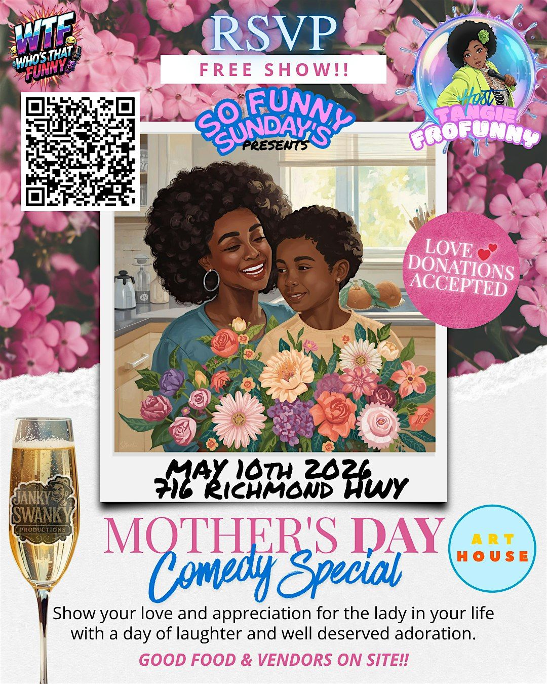Get ready to laugh your butt off at our Mother's Day Comedy Special!! Join us for an unforgettable day filled with the most hilarious laughs, good vibes, and big smiles. Whether you're celebrating your wonderful mom or just in love someones else's mom, this event is the perfect way to make the day extra special! Bring your best lady, bring your laughs, and let's make some memories special together! We only ask if you RSVP please be on time and ready to enjoy yourself and each other!