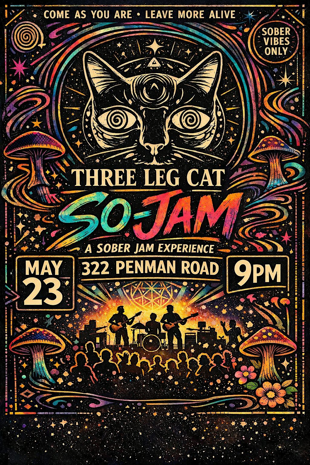 SO-JAM featuring 3 Legged Cat is a sober live music experience built for people who want real connection, real energy, and a great night without alcohol or drugs.