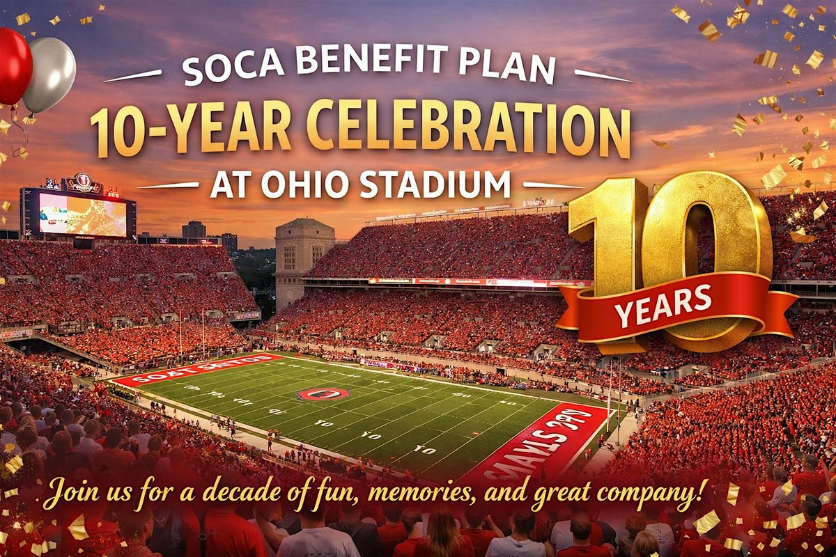 Join us in person to celebrate a decade of the SOCA Benefit Plan! It's going to be an awesome gathering filled with fun, memories, and great company, all happening at the iconic Ohio Stadium. Don't miss this chance to be part of the celebration and connect with friends and colleagues. See you there!