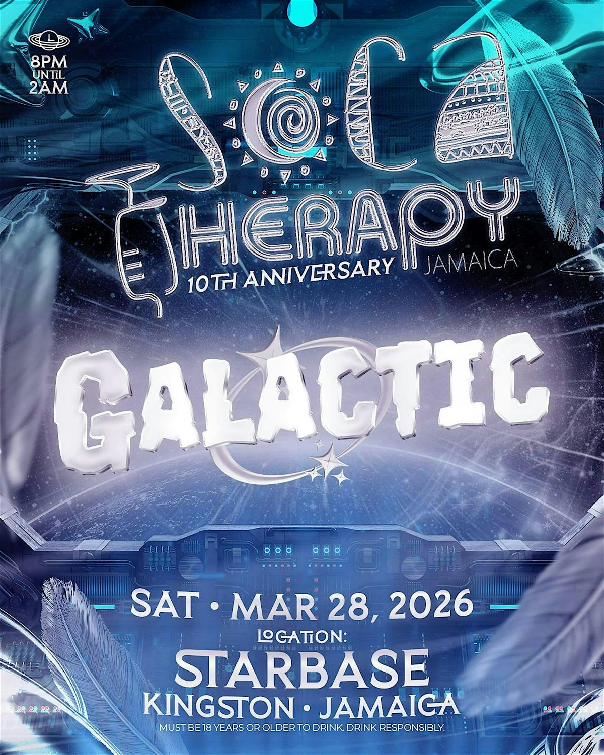 Welcome to Soca Therapy: Galactic at StarBase Jamaica! Get ready for an out-of-this-world experience on March 28, 2026 at 8:00 PM (America/Jamaica Time). Join us for a night filled with pulsating soca rhythms that will transport you to another dimension. Let the music take control as you dance the night away under the stars. Don't miss this opportunity to let loose and embrace the galactic vibes. See you there!