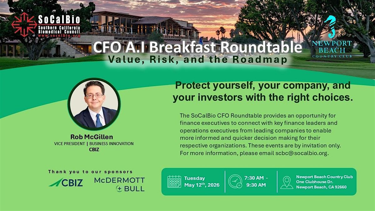 The SoCalBio CFO Roundtable provides an opportunity for finance executives to connect with key finance leaders and operations executives from leading companies to enable more informed and quicker decision-making for their respective organizations. These events are by invitation only. For more information, please email [email protected].