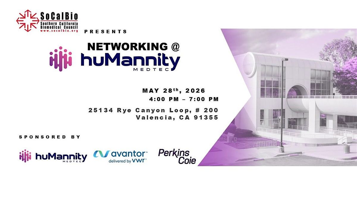 Join SoCalBio & huMannity Medtec on May 28th from 4:00 to 7:00 PM at the huMannity Medtec Headquarters in Valencia for refreshments, food, and informal networking with peers. Whether you’re looking to discuss the latest biotech updates, tour huMannity’s facilities, or simply expand your professional network, this is the perfect opportunity to connect! We hope to see you there!