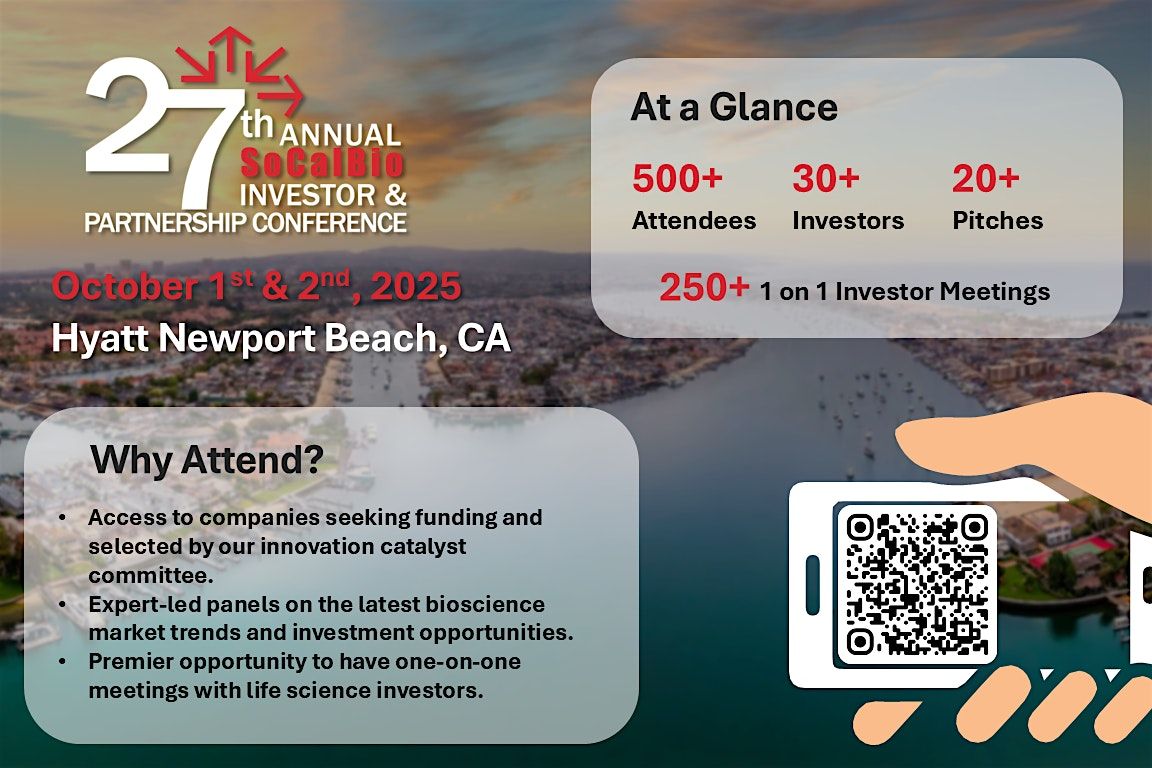 The Annual SoCalBio Conference is an event organized by the Southern California Biomedical Council (SoCalBio). This conference showcases Southern California's value-based bioscience innovations and explores efficient pathways to bring them to market. The conference will be held in person at the Hyatt Regency Newport Beach.