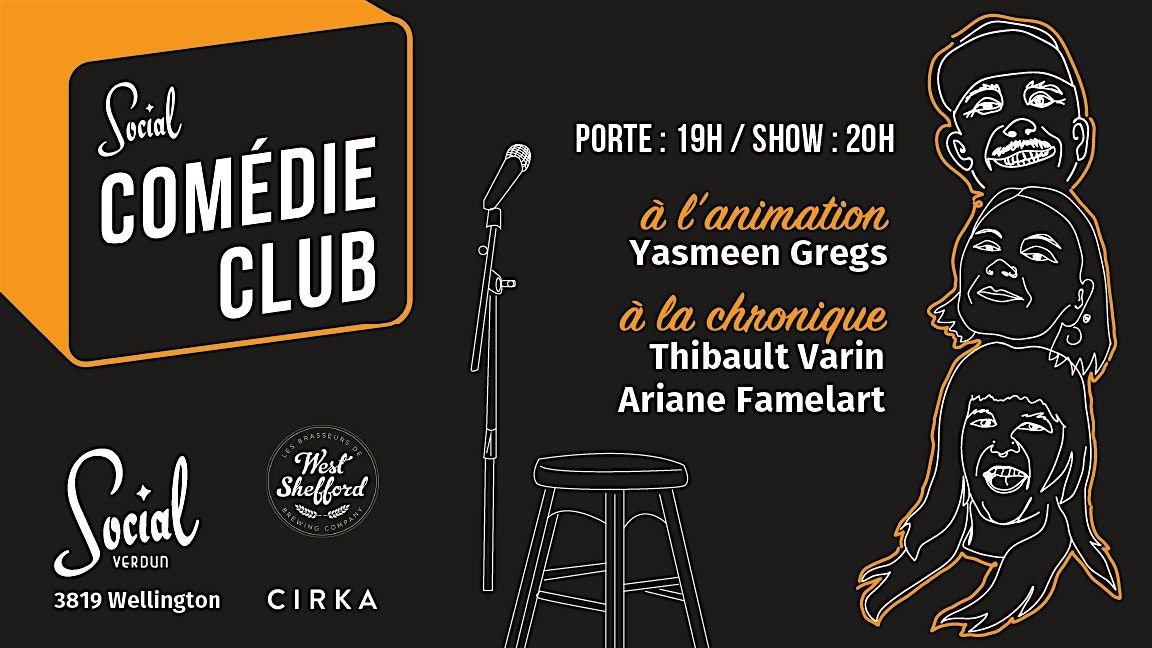 Show d'humour open-mic animé par Yasmeen Gregs et Thibault Varin + Ariane Famelart à la chronique! Tous les 1e lundis du mois au Bar Social!