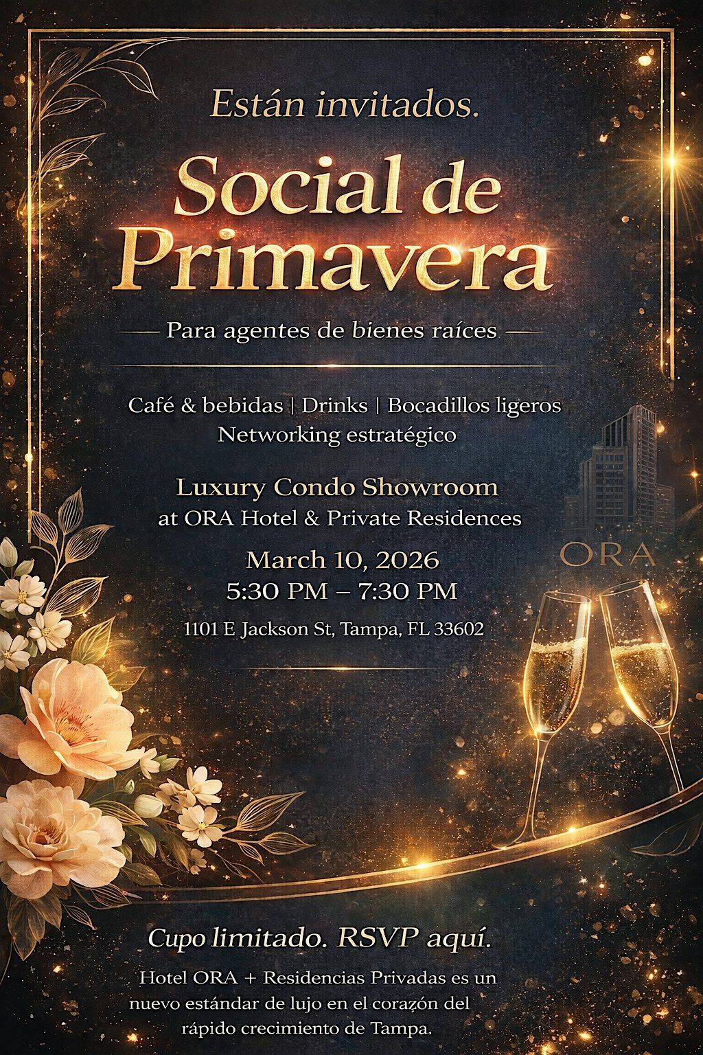 Social de Primavera en ORA Tampa para agentes. 10 de marzo, 5:30–7:30 PM. Networking, bebidas y cupo limitado.