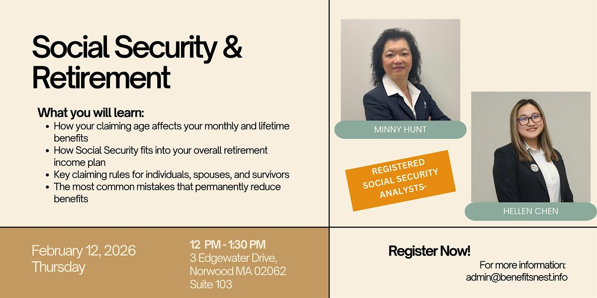 Social Security is one of the most important income sources in retirement, yet it is also one of the most misunderstood. Small claiming decisions can create permanent impacts on your lifetime income. This workshop is designed to help you understand your options clearly and make informed choices with confidence.