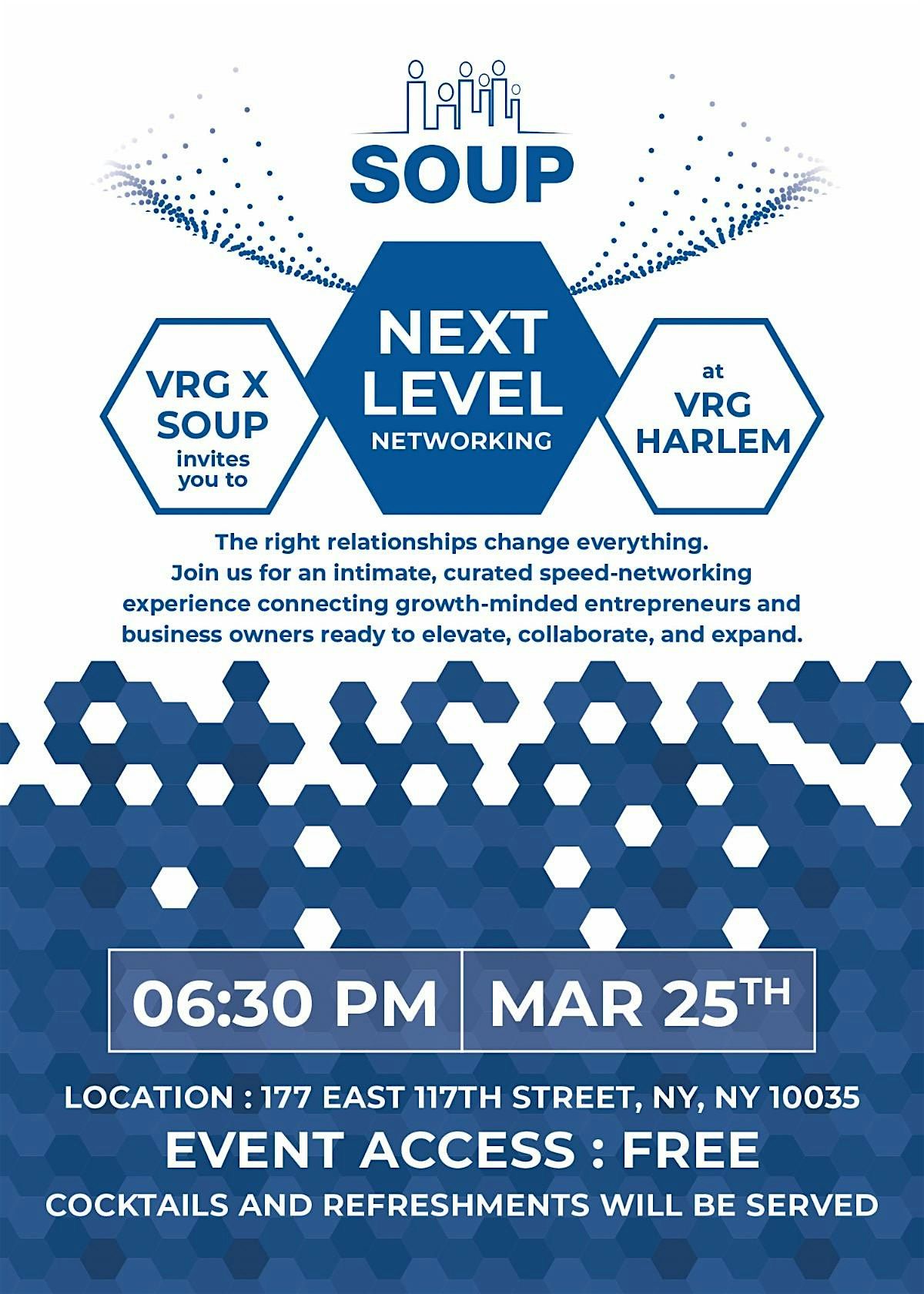 Originally scheduled for March 25 at 6:30 PM at VRG Harlem (177 E 117th St, NY), the event included cocktails and refreshments. It has now been rescheduled to April 28, 2026.