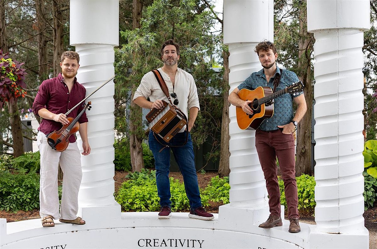 Socks in the Frying Pan are one of the most electrifying live acts in Irish traditional music today. From Ennis, County Clare — widely regarded as the beating heart of the tradition — this multi-award-winning trio have built an international reputation for explosive performances that fuse breathtaking virtuosity, pitch-perfect harmonies, driving rhythm, and razor-sharp wit.