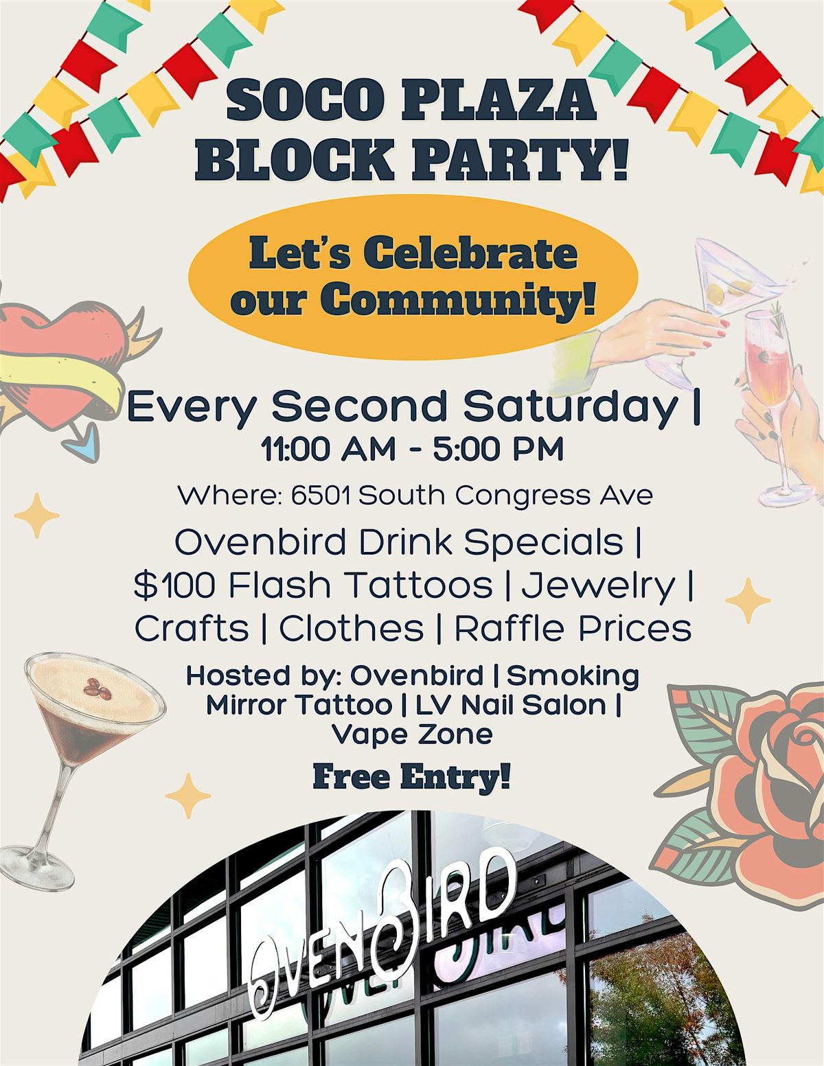 Welcome to our first annual SoCo Plaza Block Party! We will have local art/craft vendors, Ovenbird open late, $100 Flash Tattoo by Smoking Mirrors Tattoo and a fun raffle with great prizes! Free entry!