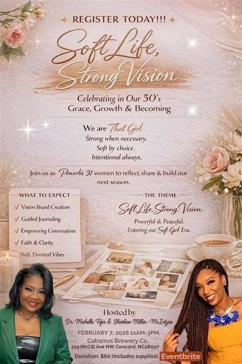 Join us for an intimate, elevated gathering designed to honor the journey and intentionally step into the next season. Soft Life, Strong Vision is a space where rest meets purpose, and reflection fuels forward movement.