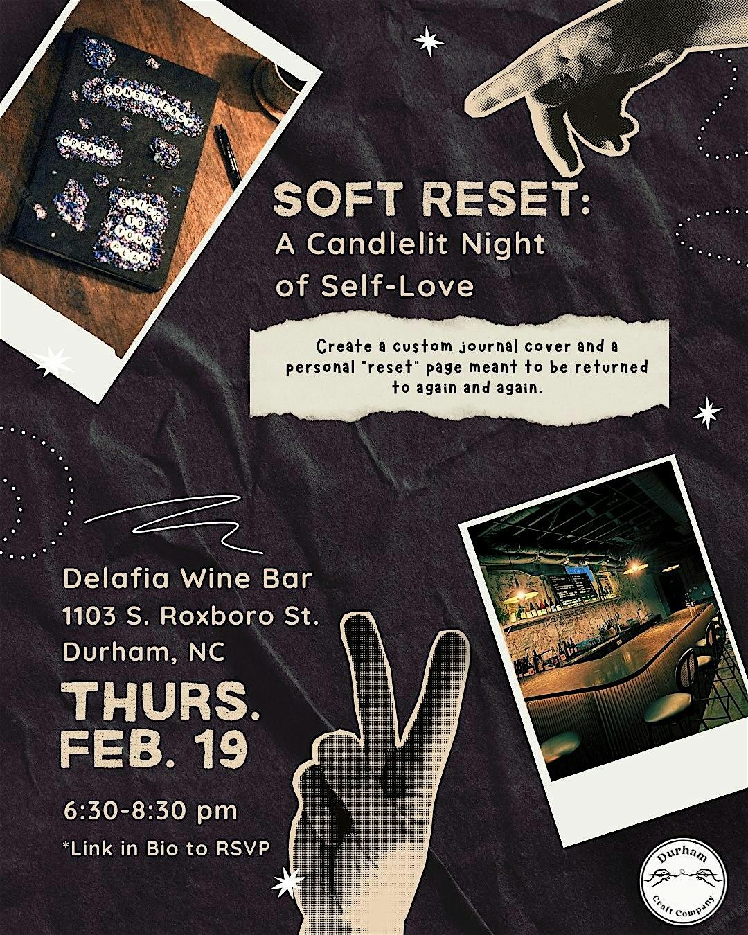 Soft Reset is a low-key, adult craft night centered on self-care, reflection, and creativity. We’ll gather around a candlelit communal table to design a custom journal cover and create a personal reset page you can return to again and again.