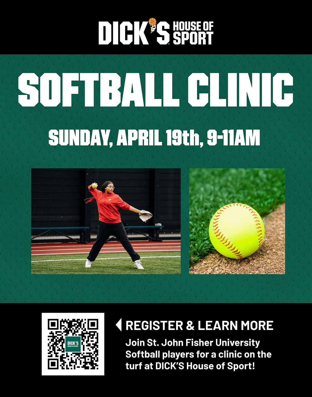 Join St. John Fisher University Softball players for a clinic on Sunday, April 19th, from 9:00 AM to 11:00 AM! Athletes (ages 8-13) will rotate through three stations