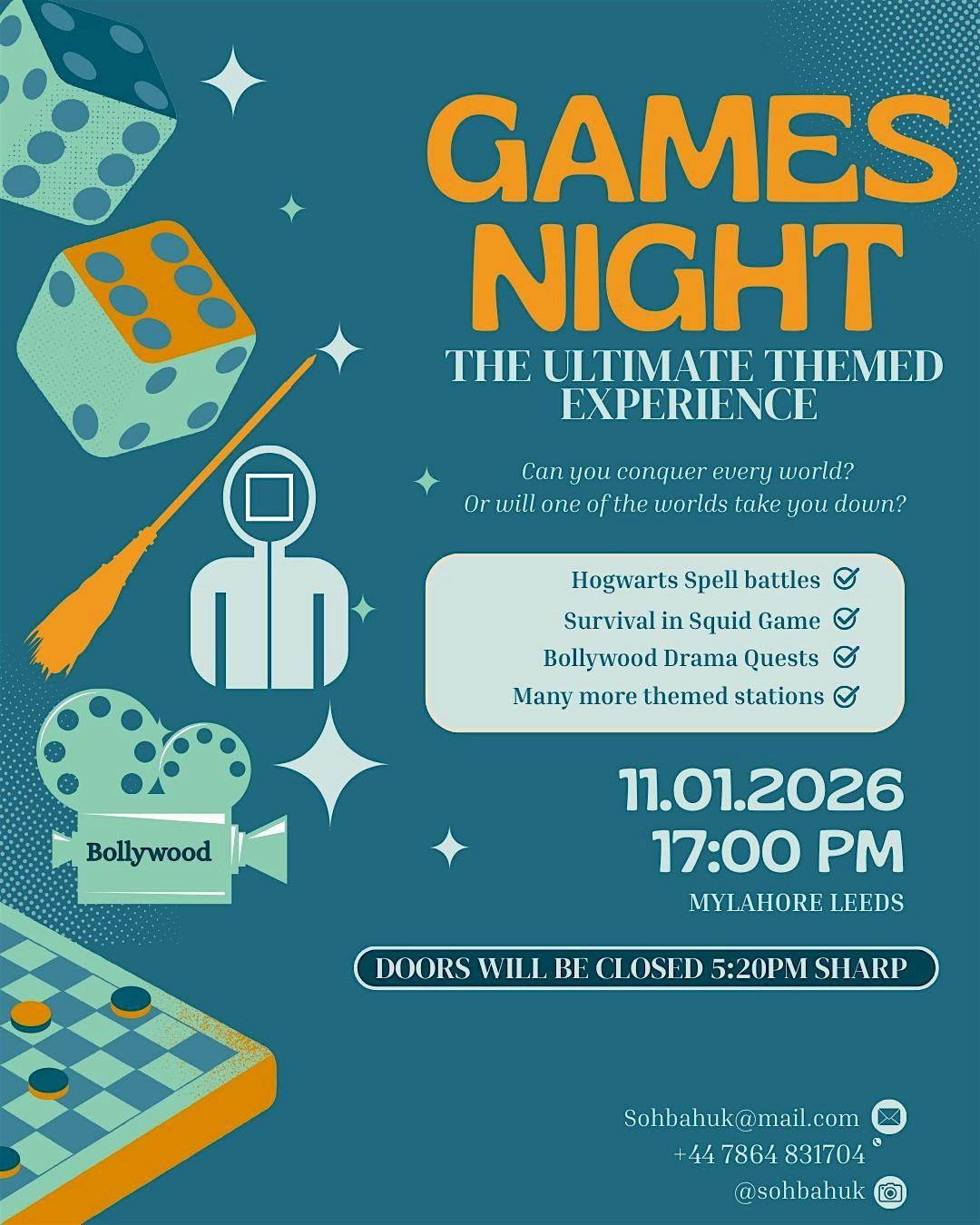 A multi-theme games night with Harry Potter, Squid Game, Bollywood & secret stations! Fun challenges and friendly competition. Join us!About this Event