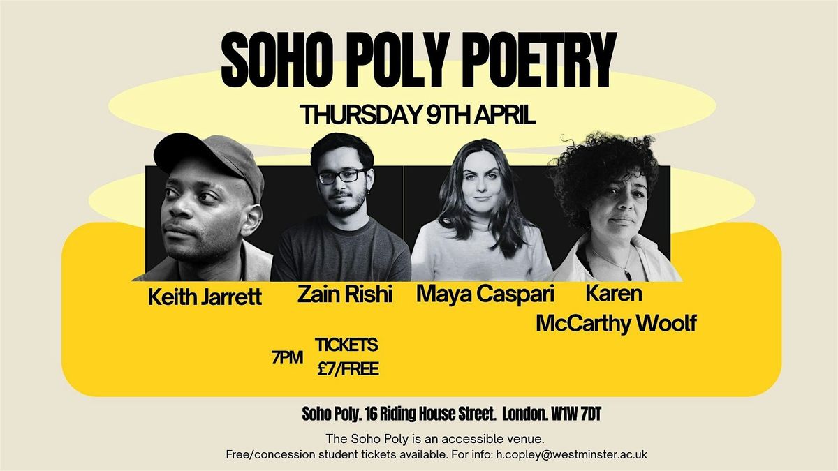 In the fifth event of the 25/26 series, we're excited to welcome Karen McCarthy Woolf, Keith Jarrett, Maya Caspari and Zain Rishi to Soho Poly Poetry for another amazing night of performance.