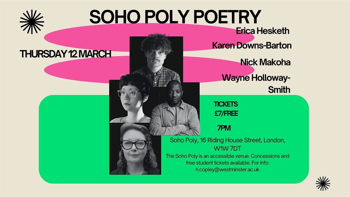 Join us at the Soho Poly for an electrifying night of poetry. In the fourth event of the 25/26 series, we're excited to welcome Erica Hesketh, Karen Downs-Barton, Wayne Holloway-Smith and Nick Makoha