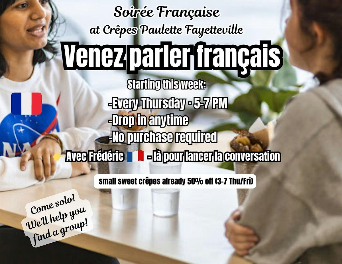 Join us for a weekly French conversation night at Crêpes Paulette in Fayetteville. All levels welcome—from beginners to native speakers.