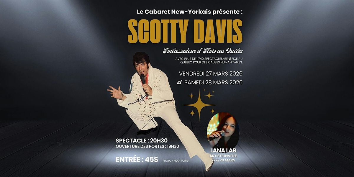 Vivez une soirée inoubliable avec Scotty Davis, l’Ambassadeur d’Elvis au Québec ! Avec plus de 50 ans de carrière et 1740 spectacles-bénéfice à son actif, Scotty Davis vous transporte dans l’univers légendaire du King, Elvis Presley, avec une énergie et une passion inégalées.Pour ces deux soirées exceptionnelles, il sera accompagné de l’artiste invitée Lana Lab.