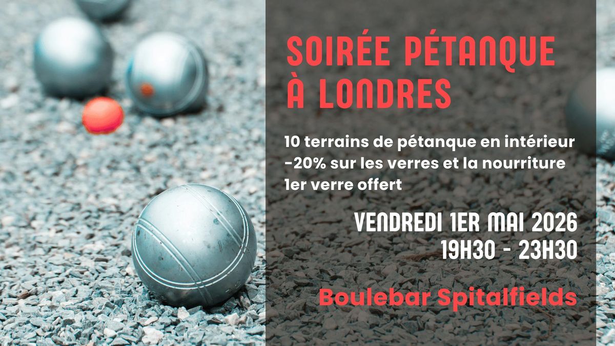 Rendez-vous le vendredi 1er mai 2026, de 19h30 à 23h30, au Boulebar Spitalfields pour une expérience originale qui sent bon la France. Que vous soyez joueur confirmé ou simple amateur de moments chaleureux entre amis, cette soirée est faite pour vous.