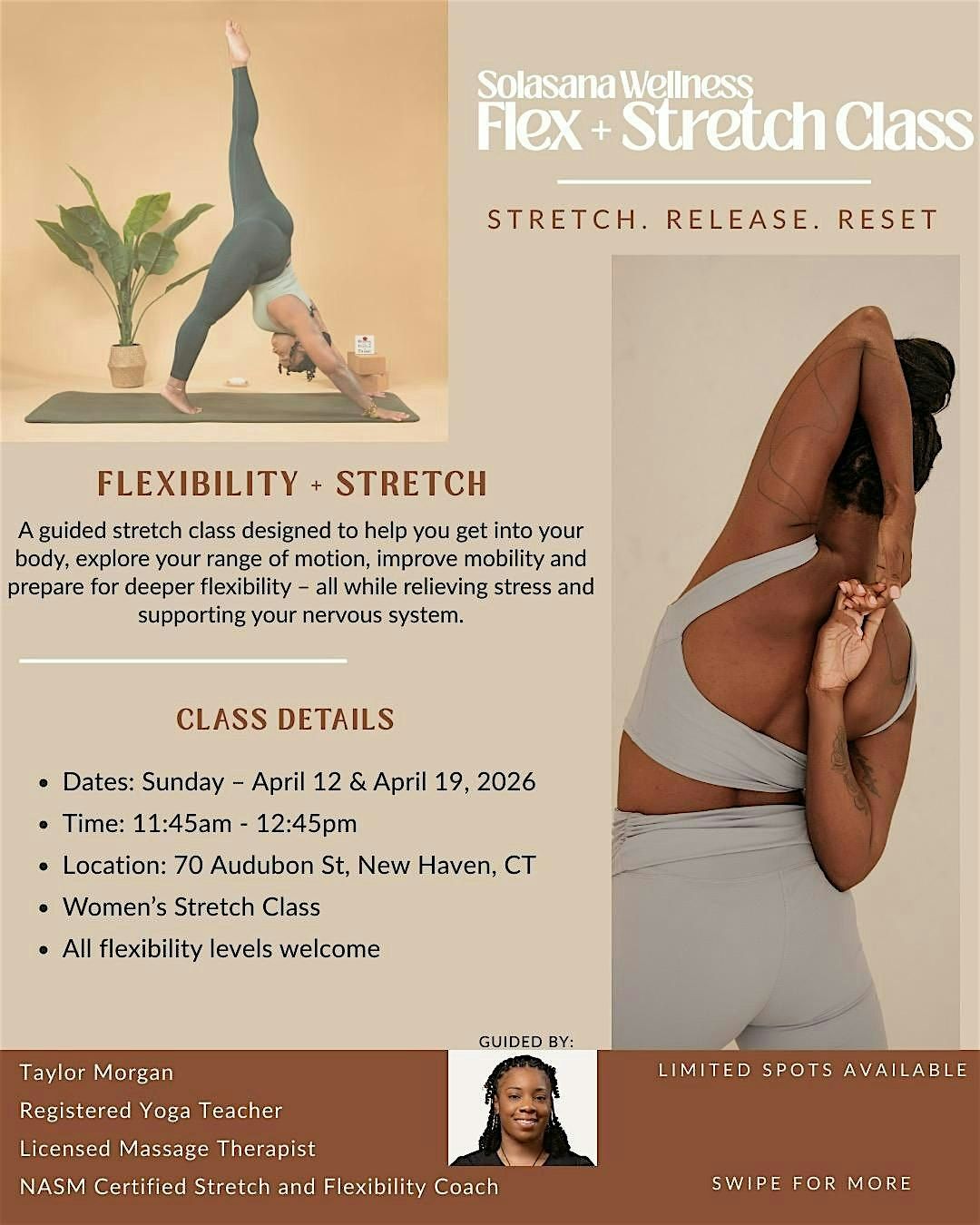 Flex + Stretch by Solasana Wellness is a guided stretch and mobility class designed to help you release tension, improve flexibility, and explore your body’s range of motion in a supportive environment.