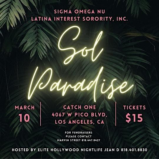 The lovely ladies of Sigma Omega Nu proudly present our annual Sol Paradise, playing the best of Hip Hop and Reggaetón all night long! Get ready to dance to your favorite bangers and lose yourself in the captivating rhythms of Latin-Caribbean music. We are taking over Catch One Los Angeles, one of the hottest clubs in town, on Friday March 10th. The doors open at 9PM and we'll be partying until 2AM. Don't miss out on this unforgettable experience with nonstop dancing and entertainment all night long - get your tickets before they're gone!