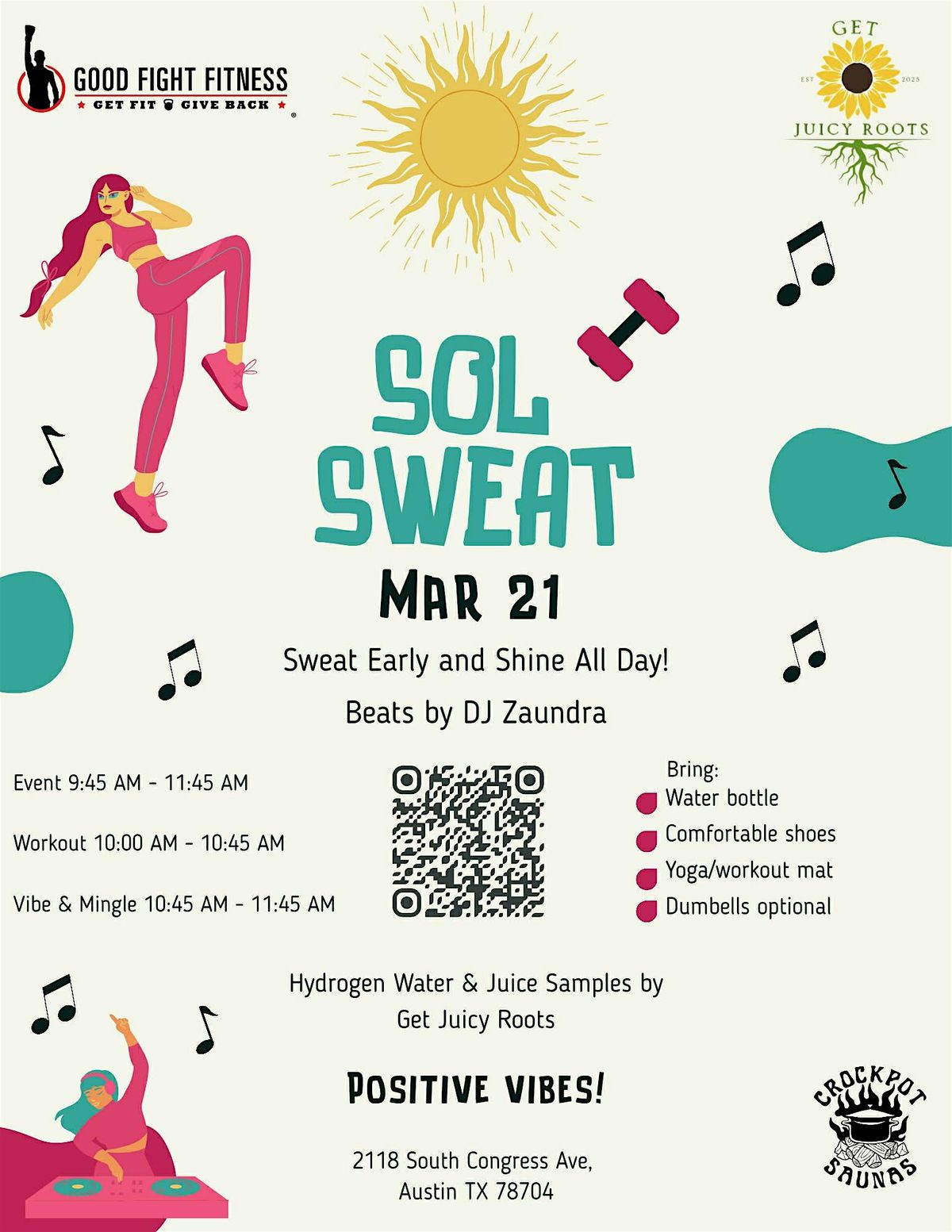 Start your morning by breaking a sweat during a fun and dynamic workout led by Good Fight Fitness, set to live beats from DJ Zaundra. This session is designed to get your body moving, boost your energy, and kick off your day with positive momentum.