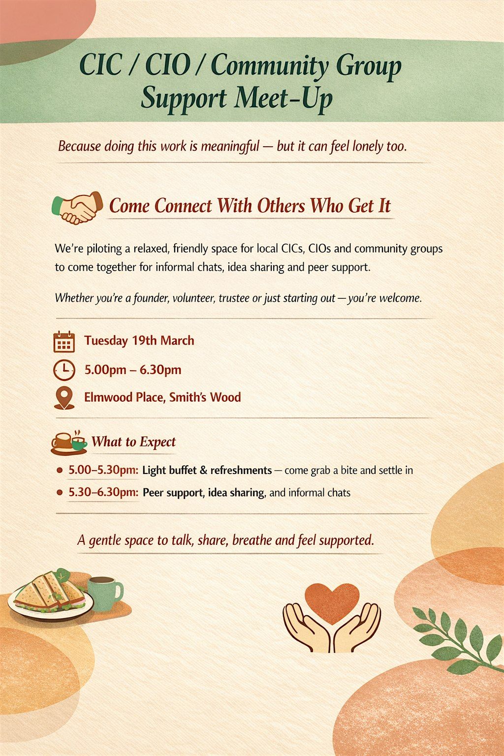 Working in community organisations can be incredibly rewarding, but it can also feel isolating when you’re carrying so much on your shoulders. That’s exactly why we’re piloting a relaxed, welcoming space for local CICs, CIOs and community groups to come together.
