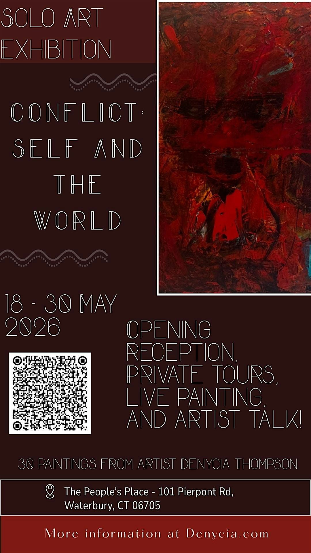Denycia's Conflict: Self and the World tour. 30 abstract and mixed media works of art on display for two weeks.About this Event