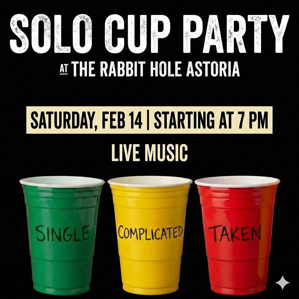 Kick off Valentine’s weekend at The Rabbit Hole Astoria with our Solo Cup Party, happening on Valentine’s Day.