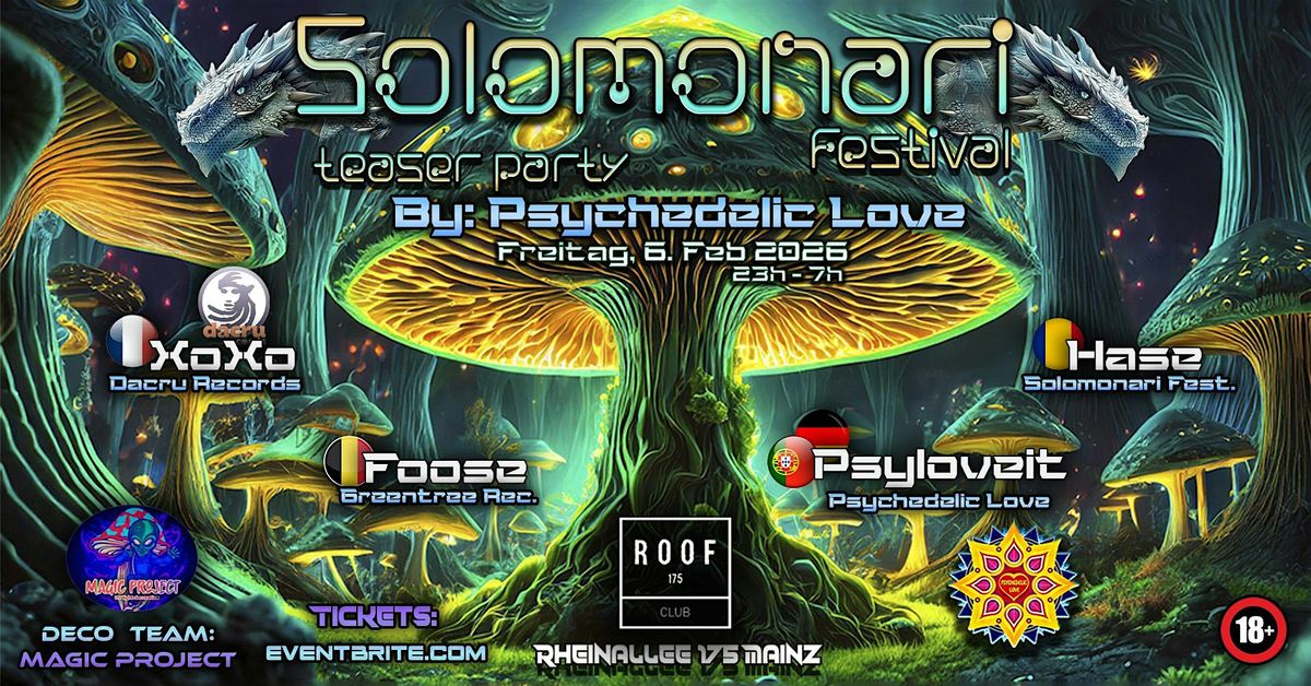 BIG GIVEAWAY 10 ×1 Festival Tickets to SOLOMONARI FESTIVAL 2026 Ludoș, Romania June 18–21, 2026 Festival gate price: 140 € + processing feesReady for 4 days of music, freedom, underground vibes, and unforgettable experiences?Then this is your chance — join our raffle and win! PRIZE 10× 1 Full Festival Ticketsfor SOLOMONARI FESTIVAL 2026 HOW TO PARTICIPATEYou can join on Facebook, Instagram, or both (joining on both increases your chances!): Follow PSYCHEDELIC LOVE & SOLOMONARI FESTIVAL Like this post Comment with who you want to visit SOLOMONARI FESTIVALLinks https://linktr.ee/psychedelic.love.events WHAT AWAITS YOU IN ROMANIA Music Art Freedom Underground vibes Culture Countless unforgettable momentsDacru.rec is one of the organizers — reason enough to know this will become one of the most exciting new festivals worldwide. Don’t miss this opportunity!Tag your friends and invite them to participate — they might be dancing next to you on the floor! DRAW DETAILSends: 05.02.2026 at 6:00 PM Winners will be announced via comment and private messageAnd than we will give the tickets to the winners at the teaser party.We give the tickets to the winners at the TEASER PARTY IN ROOF 175 Important:Tickets are personalized with the winner’s name and are only valid with matching official identification. Good luck & see you on the dance floor!