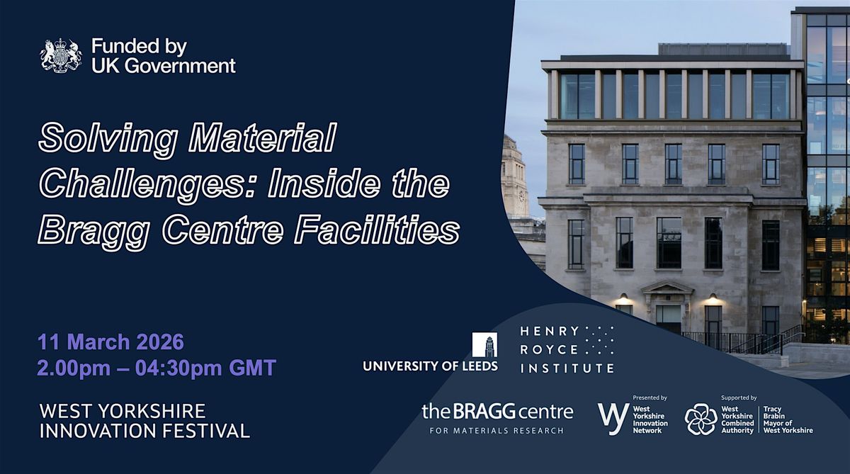 This event is an open-house tour format, that will begin with an overview of the Bragg Centre, then proceed into 3 parallel tours of the 9 materials characterisation and fabrication facilities available for use by industry, and end with a networking reception. Join us to hear about the cutting‑edge research transforming tomorrow’s technologies, the funding and support available to access our world‑class facilities, and the routes for collaborating with our academic innovators.
