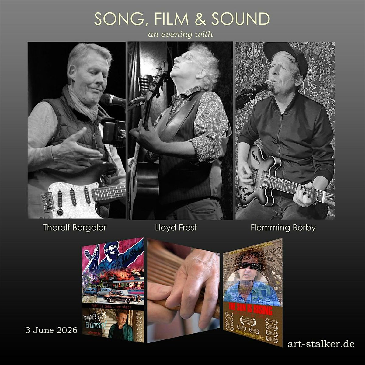 Der multimediale Abend bietet ein abwechslungsreiches Programm mit dem bekannten dänischen Musiker Flemming Borby (GREENE, LABRADOR), Thorolf Bergeler, der außerdem eine Foley-Demonstration (von ihm für Spielfilme kreierte Soundeffekte) gibt, und dem Kanadier Lloyd Frost, der seine beiden preisgekrönten Musikvideos (In Everyone’s Eyes, The Sun Is Rising) zeigt.