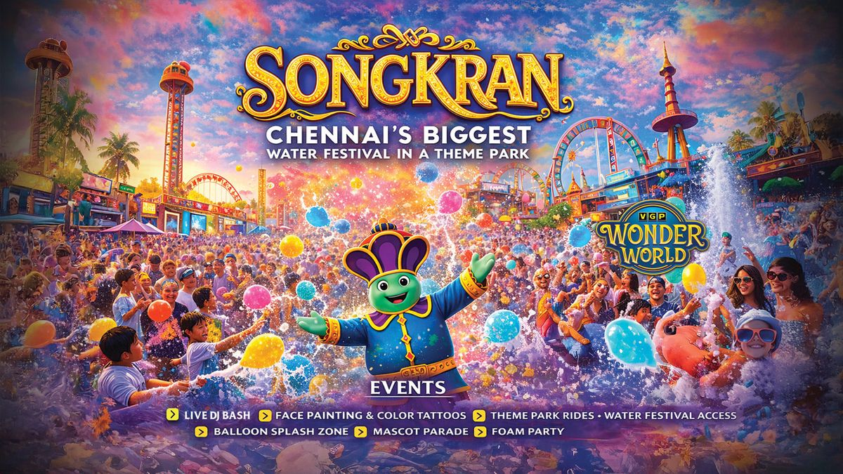 Get ready for SongKran β Chennaiβs Biggest Water Festival in a Theme Park, a vibrant celebration filled with music, water fun, and exciting attractions for all ages.Step into a lively festival atmosphere featuring a Live DJ Bash, colorful Face Painting & Color Tattoos, and a high-energy Foam Party. Enjoy access to thrilling Theme Park Rides and the Water Festival zones, cool off at the Balloon Splash Zone, and catch the fun Mascot Parade bringing the park to life.With water-filled activities, music, and non-stop entertainment all around, SongKran promises a fun, splashy day out for friends and families looking to celebrate together. ππ