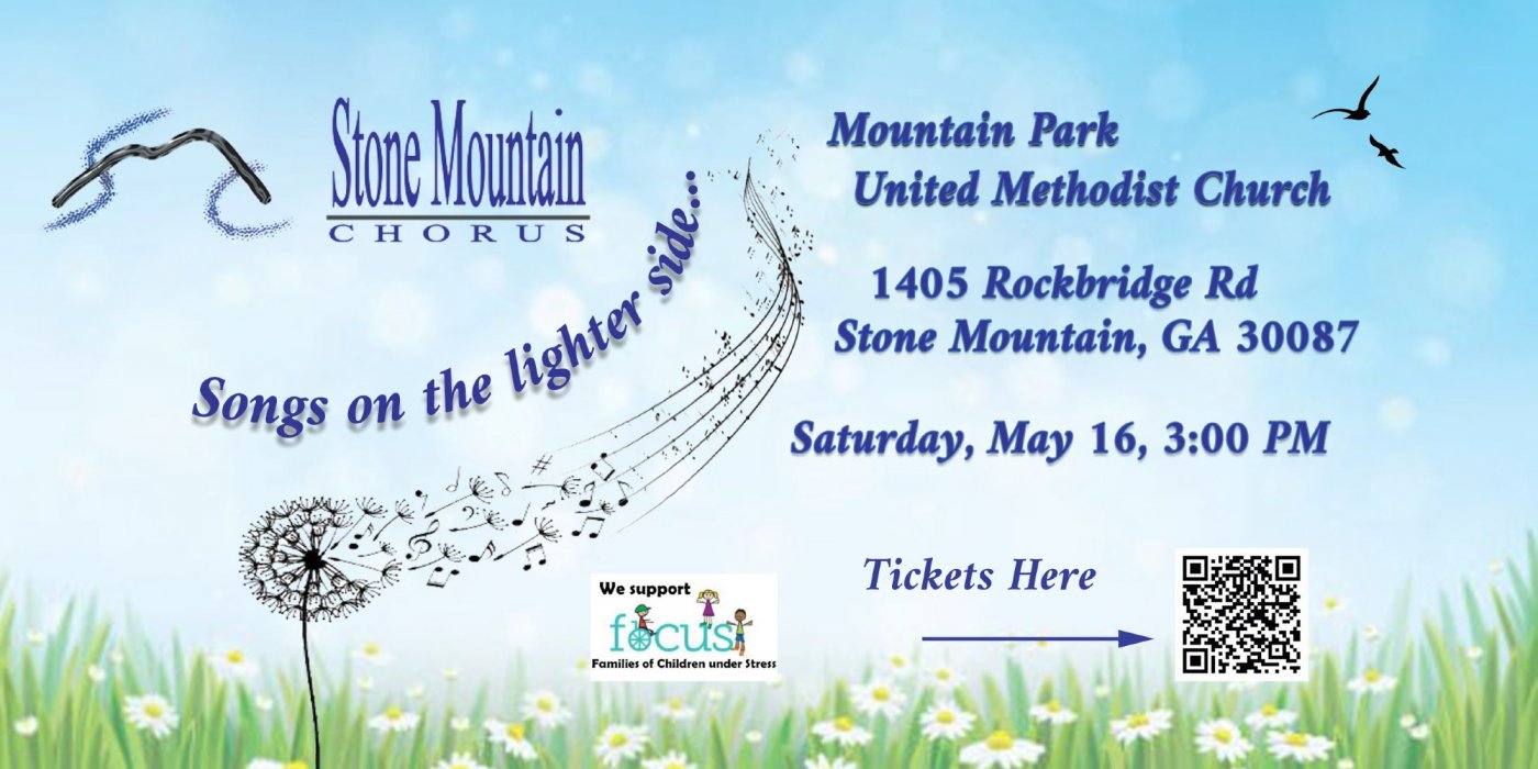 So come on in out of the pollen and hear some great music! The show is Saturday, May 16th, 3:00 PM at Mountain Park United Methodist Church. Tickets are on sale now at StoneMountainChorus.org. As with all Stone Mountain Chorus productions, a portion of thicket sales is donated to Atlanta charity FOCUS (Families of Children under Stress.)
