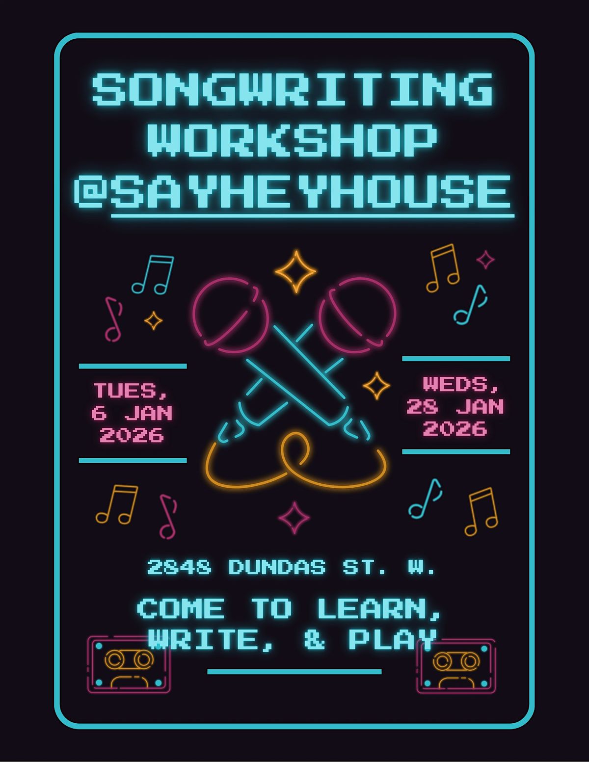Join us for a beginner-friendly songwriting workshop at Say Hey House in the Junction.