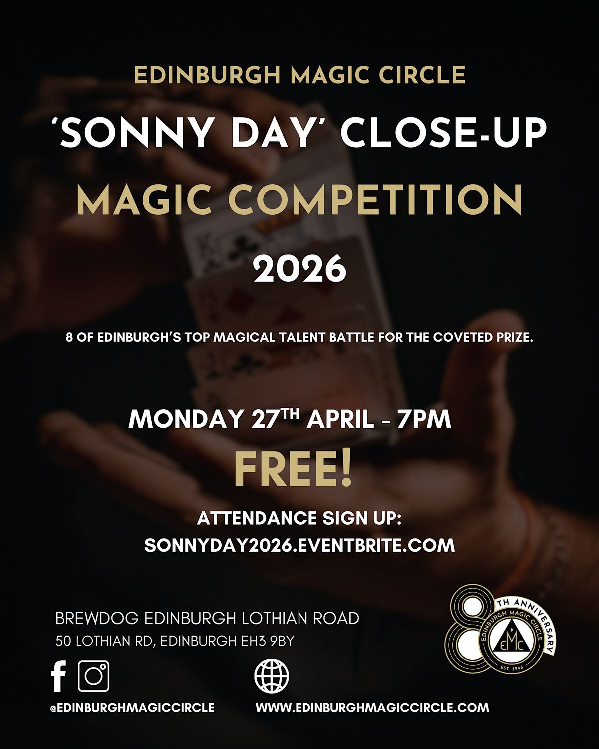 Welcome to the ultimate showdown of Edinburgh's close-up magic! Witness mind-blowing tricks and illusions at the Sonny Day Close-up Magic Competition 2026! Join us at BrewDog Edinburgh Lothian Road for an evening filled with amazement, fun and laughs. Get ready to be amazed by talented magicians from all over showcasing their skills up close, and then take part in the judging yourself!