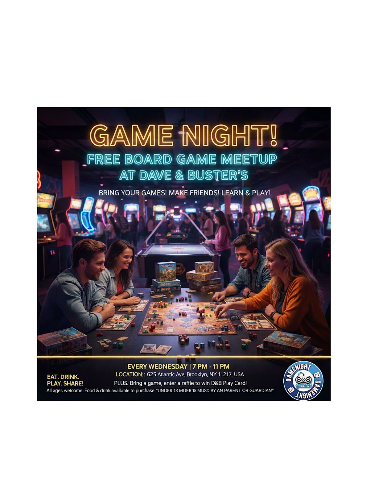 > Bring a Game, Get a Chance to Win: If you bring a board game from home to share with the group, you will automatically be entered into a raffle for a Dave & Buster’s Play Card.