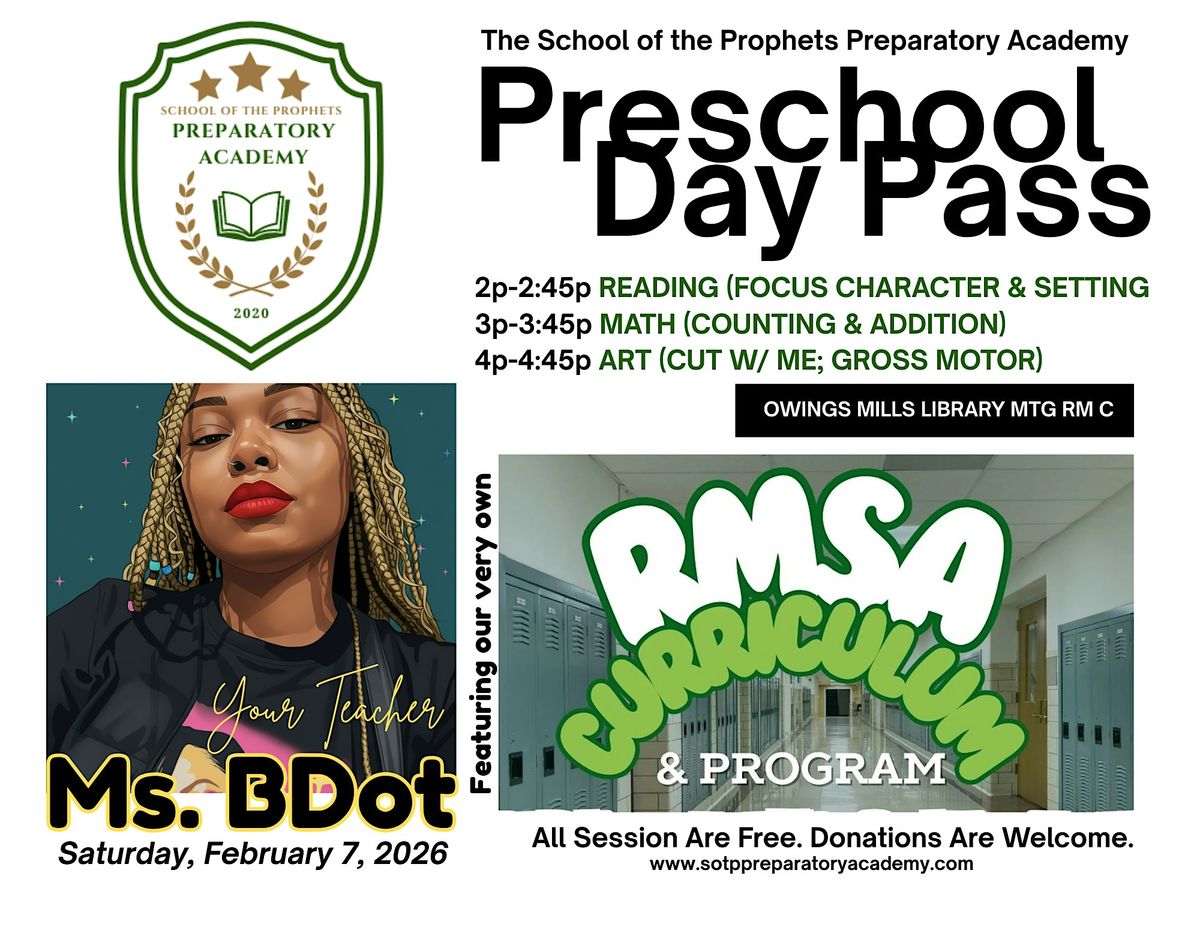 Join us for a special FREE Preschool Day Pass featuring three engaging 45-minute sessions, with your teacher Ms.BDot, designed exclusively around our exclusive RMSA Curriculum (Reading, Math, Science & Art). You do not have to attend all sessions. Build your evening with the ones you feel are a best fit for your scholar.