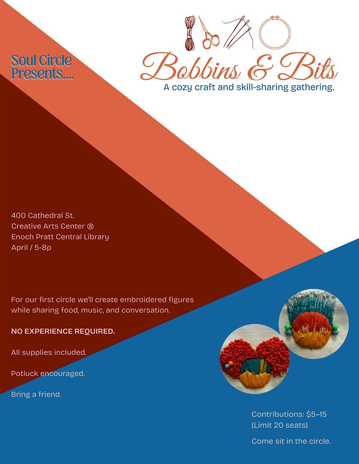 The first circle will be simple: we’ll create embroidered figures while enjoying music, a potluck-style meal, and good company.