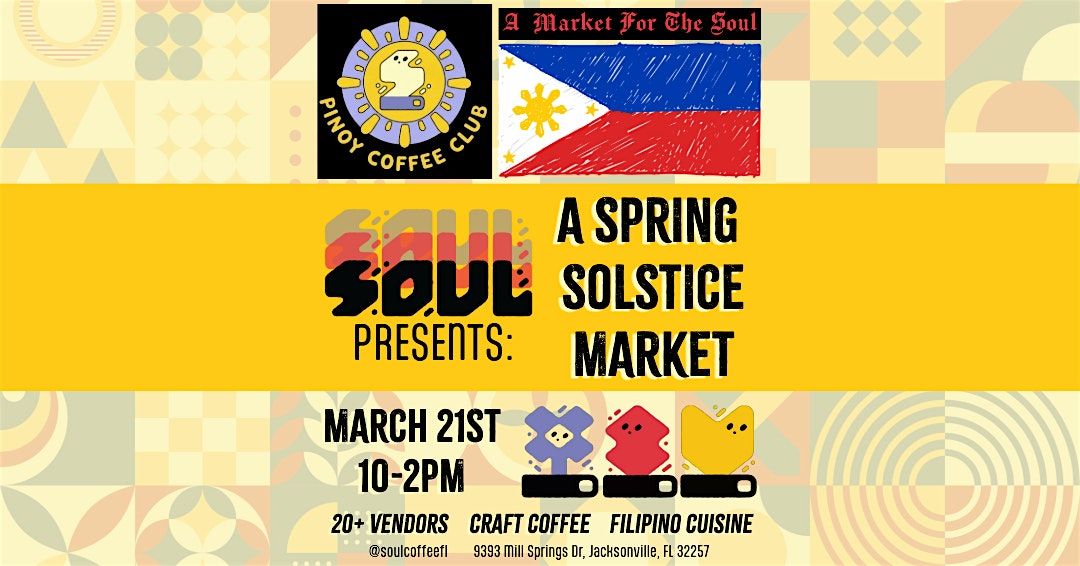 If you missed November's Soul Coffee Market, NOW IS YOUR CHANCE to come experience it once again. Join us for a spring SOUL-Stice celebration, if you will! We're gonna have filipino food from Nario's Nuk, Polvoron from Sofya Dolce, Sweet Treats and amazing craft coffee from Soul: Come try their newly launched spring menu during its debut! While you're sipping and munching, you can also shop a vendor village of amazingly talented artists and craftspeople who truly make the Soul Community what it is. We hope to see your smiling faces!