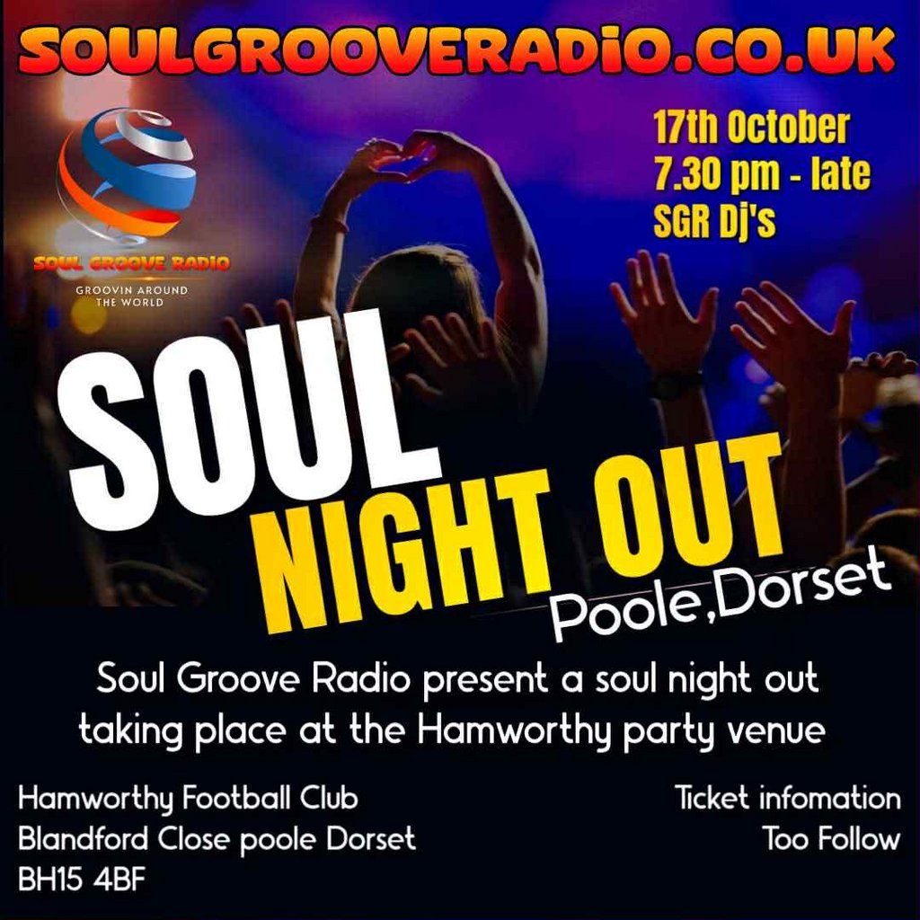 Soul Groove Radio are holding a Soul Night out on Saturday 17th October 2026 at Hamworthy Party Venue Poole DorsetMusic Genres : R&B, Soul, Funk, Disco, Northern Soul