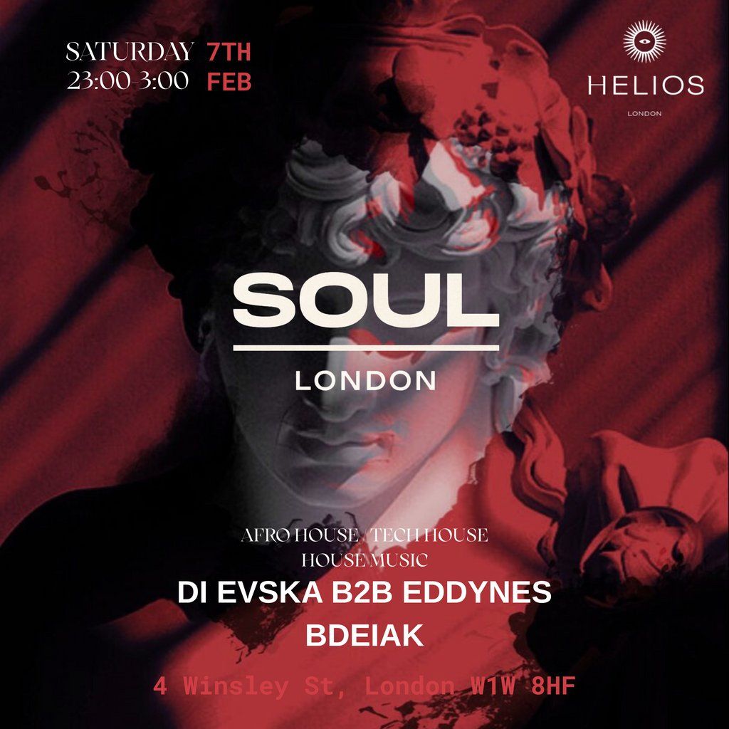 SOUL LONDON presents a hypnotic Afro house / Tech House / House music / journey at Helios with DI EVSKA b2b EDDYNES and BDEIAK.Music Genres : House, Tech House