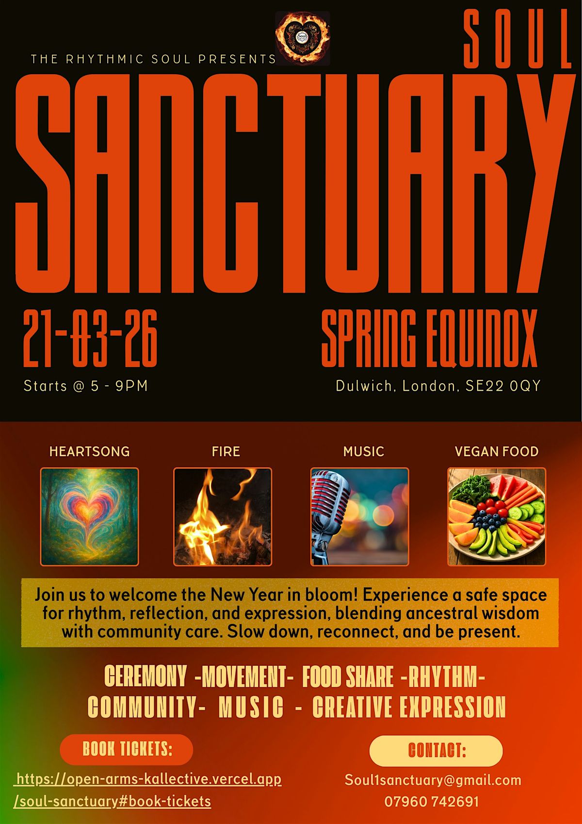 Celebrate the arrival of spring with us in person at Soul Sanctuary. Join us to welcome the season of growth with open hearts and minds, we welcome you into our sacred garden space. You can expect uplifting energy and soulful connections alongside nature. A harmonious blend of music and artistic expression, with interactive performances by the hosts, poets, singers and musicians.