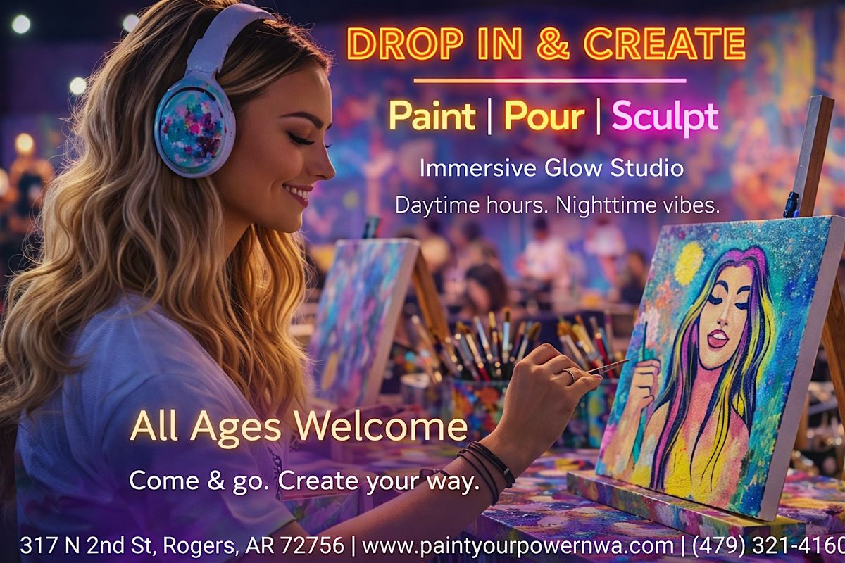 Drop in anytime during open hours and paint at your own pace inside the immersive world of Paint Your Power — glowing lights, moving projections, and a vibe that feels more like a creative escape than a class.