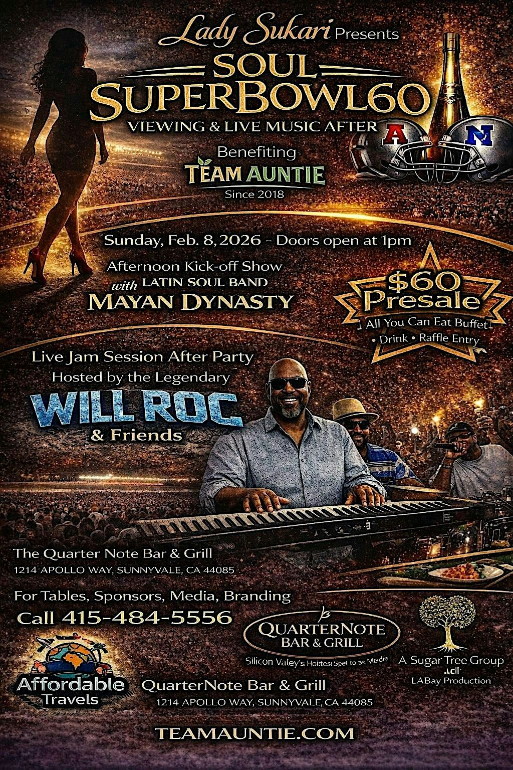 Each Ticket includes All You Can Eat Buffet (vegetarian options incl),1st Drink, Raffle entry, Fun-Raising Activities all night, enjoy 50/50 Raffles and more, It's Live Music At its best, Kicking off with Mayan Dynasty and ending the night with Legendary Will Roc and friends, with Top musicians and artists from the Bay area and around the world - Experience the Quarter Note like never before with extended event space and outdoor patio with ample viewing screens for the Big Game. Will Roc is debuting his Return Live at Quarter Note once a month. Its a show you dont want to miss. "Treat Yourself" -Live in Silicon ValleyQuarter Note