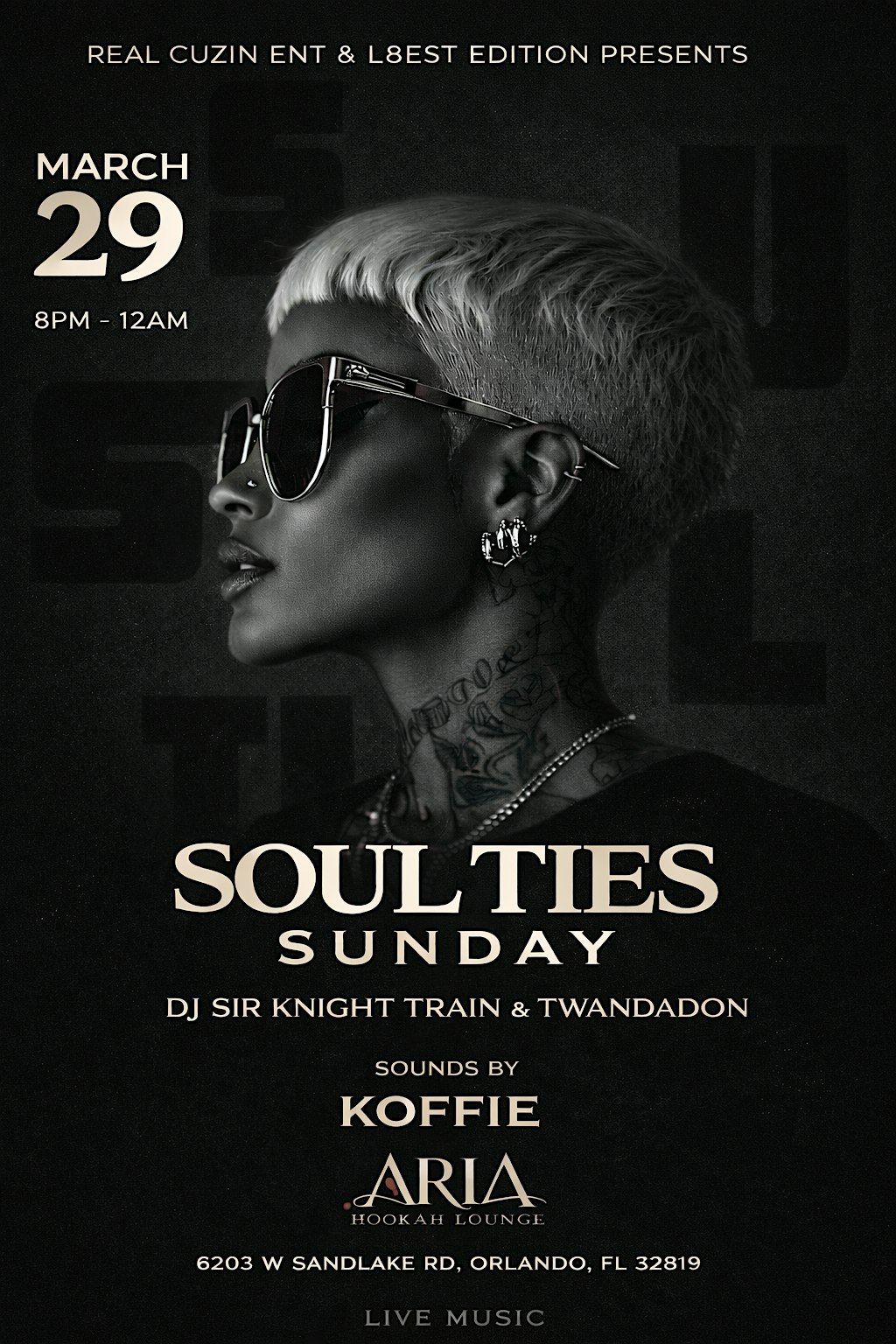 Get ready for an awesome night at Aria Hookah & Bar! Join us on March 29, 2026 at 8pm (Eastern Time) for some chill vibes and live tunes with Soul Ties. Whether you're coming with friends or flying solo, it’s the perfect spot to kick back and enjoy great music in a relaxed atmosphere. Don’t miss out on this cool in-person event!