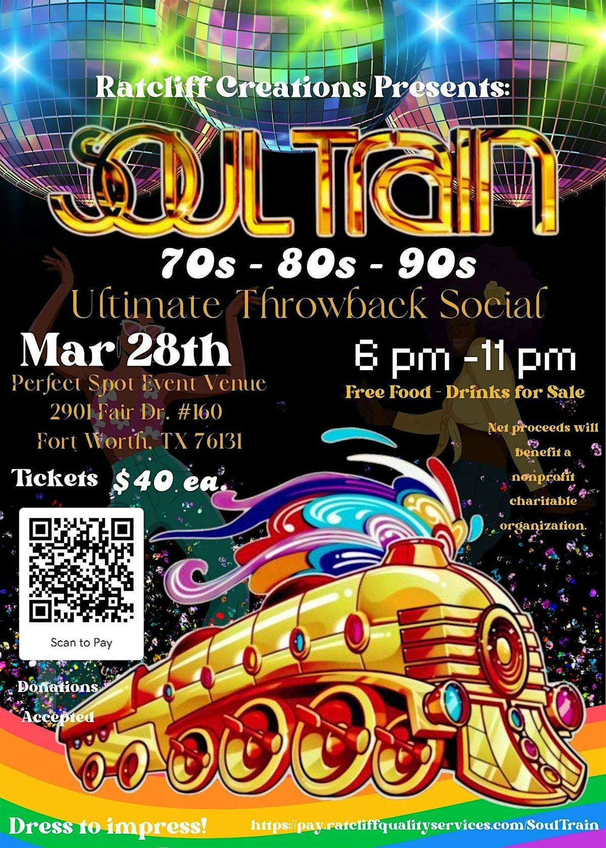 You’re invited to Ratcliff Creations Presents: Soul Train 70s, 80s & 90s Ultimate Throwback Social! Join us on March 28th from 6:00 PM to 11:00 PM at Perfect Spot Event Venue, 2901 Fair Drive, Suite #160, Fort Worth, TX 76131 for a night of classic vibes, dancing, and community connection. Tickets are $40 each and include free food, with drinks available for purchase, so be sure to dress to impress and come ready to groove. Hosted by Ratcliff Quality Services LLC, all net proceeds will benefit Net proceeds will benefit a nonprofit charitable organization.—scan the QR code to purchase your ticket or use the pay link: . We hope to see you there! 🕺🏽💃🏽