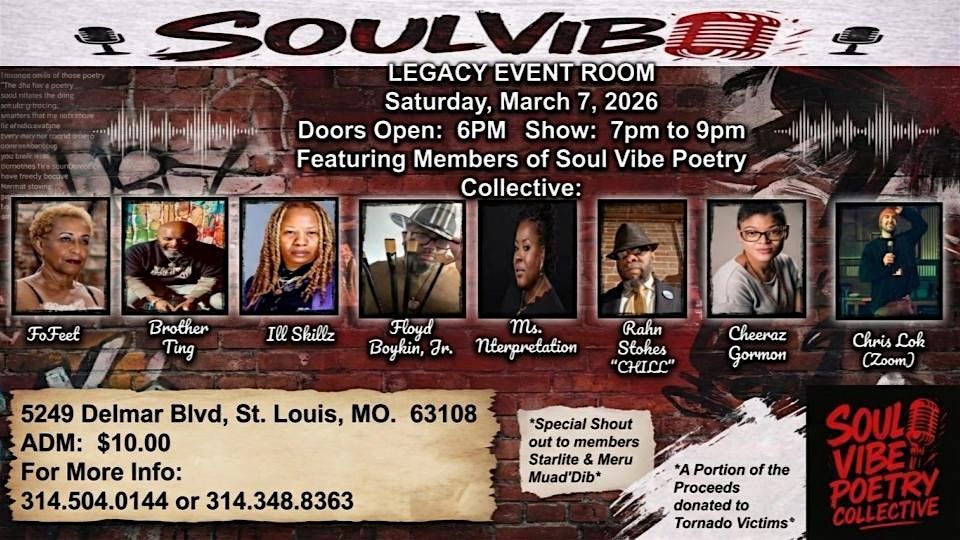 Soul Vibe Poetry Collective Presents a Powerful Night of Spoken Word at Legacy Event Room St. Louis, MO — March 7, 2026 — The Soul Vibe Poetry Collective invites the St. Louis community to an unforgettable evening of live spoken word, artistic expression, and cultural connection at the Soul Vibe Live Poetry Experience. This dynamic showcase will feature an exceptional lineup of poets and performers known for their compelling voices, creative storytelling, and powerful stage presence, including: